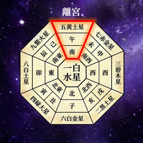 上にある南の位置は、本来、九紫火星がいる場所です。九紫火星は、真昼の太陽、知性、美、芸術を象徴する星です。